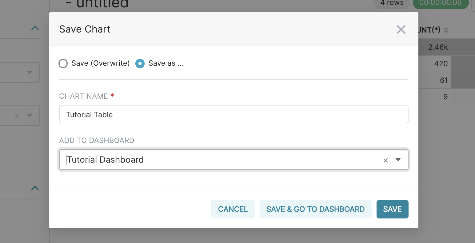 • Select Add To Dashboard and enter Tutorial Dashboard. Finally, select Save & Go To Dashboard.